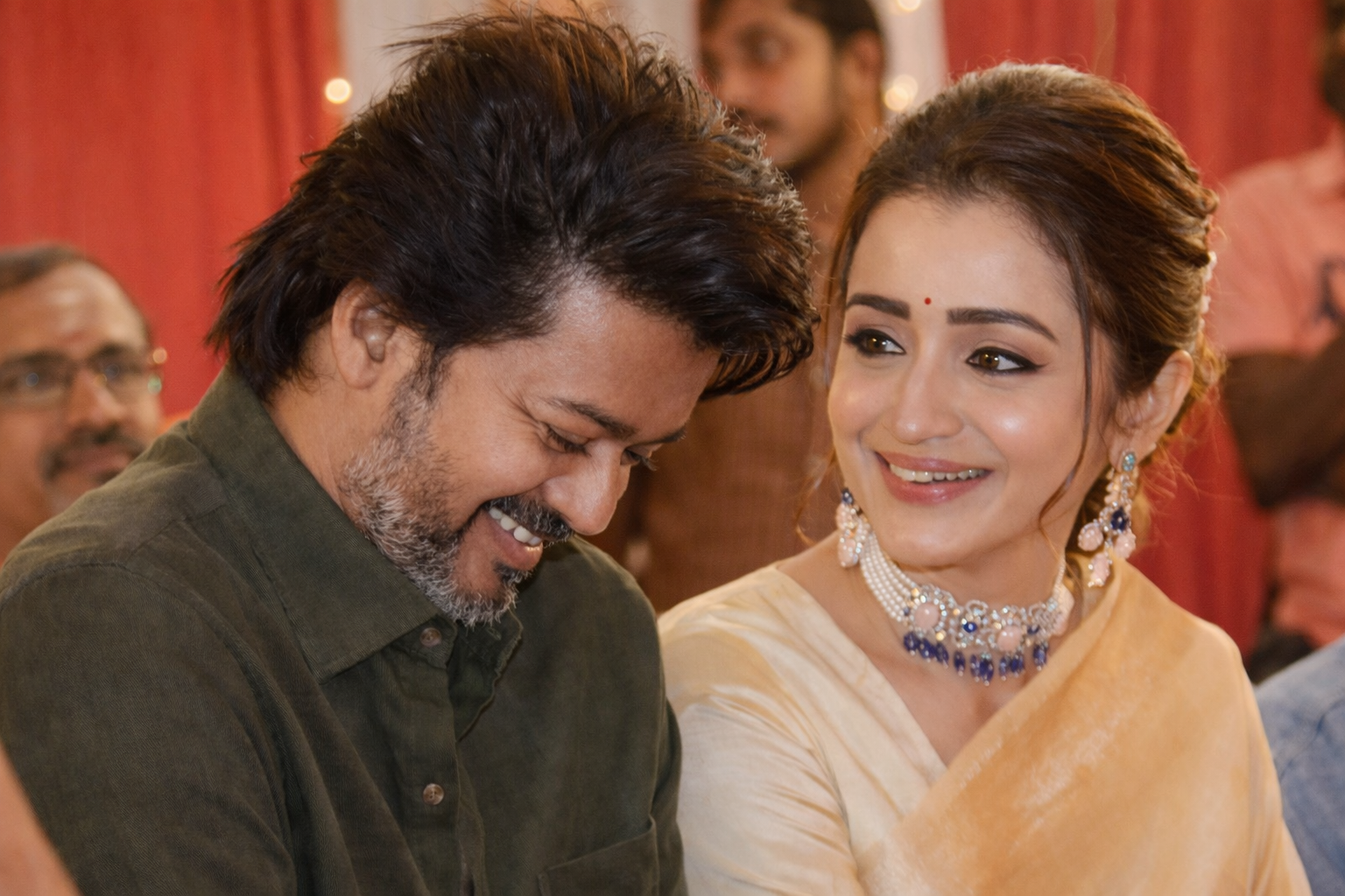- ഒരേ നിറത്തിലുള്ള വസ്ത്രങ്ങൾ: ചടങ്ങിൽ വിജയും തൃഷയും ഒരേ നിറത്തിലുള്ള (Beige/Cream) പരമ്പരാഗത വസ്ത്രങ്ങളാണ് ധരിച്ചിരുന്നത്. ഒരേ കാറിൽ വേദിയിലെത്തിയ ഇരുവരും ഒരുമിച്ച് സ്റ്റേജിലെത്തി നവദമ്പതികളെ ആശീർവദിക്കുകയും ഫോട്ടോയ്ക്ക് പോസ് ചെയ്യുകയും ചെയ്തു.
